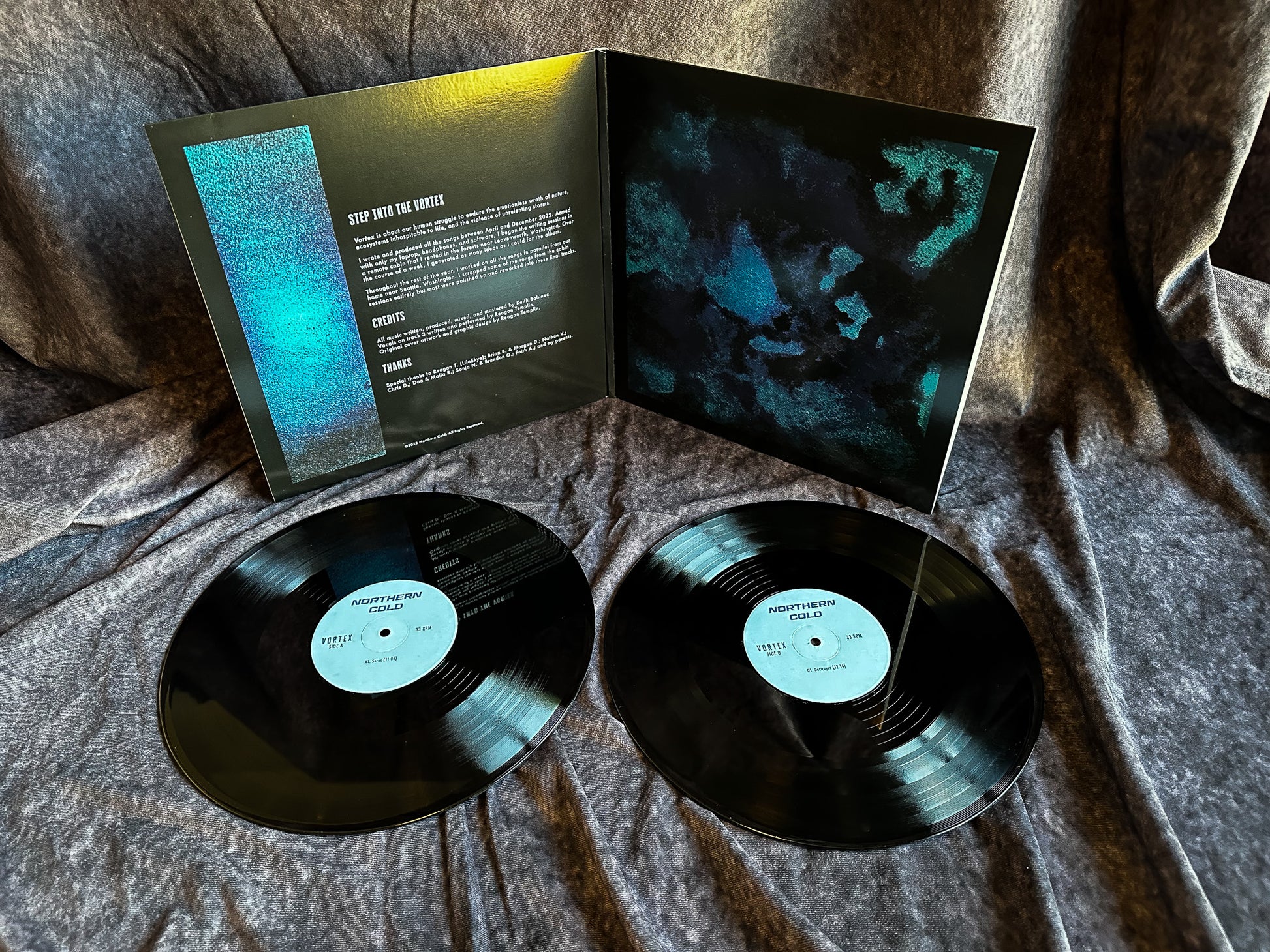 Northern Cold's debut full length album "Vortex". Pressed to vinyl (33RPM, 150g, 2xLP) with beautiful gatefold packaging in two different color variants (black and blue). Limited to 200 copies. Digital download card included with shipment.